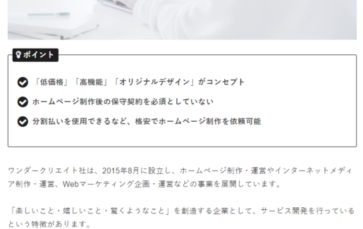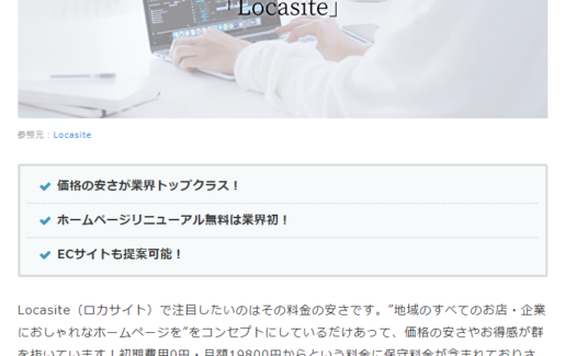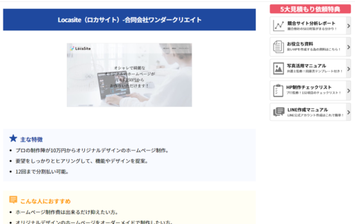Web制作情報メディア「CMS NAVI」さんで松戸市で1番おすすめのホームページ制作会社と評価を受けました!弊社のオリジナルデザインなのに他社と比較して安い点、自社メディアで結果を出している点などが高く評価されました。※現在はサービス名であるLocasiteではなく、会社名である合同会社ワンダークリエイトとしてホームページの制作・保守を行っております。
